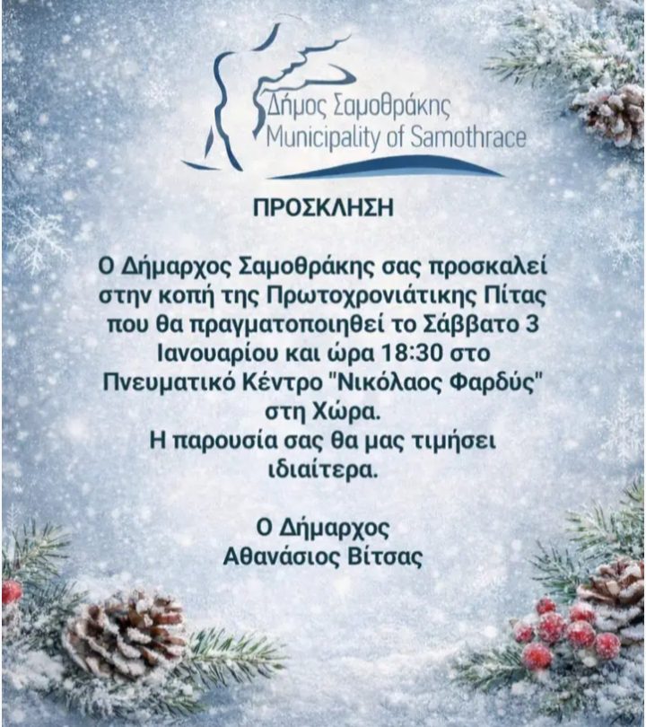 Ο Δήμαρχος Σαμοθρακης σας προσκαλεί στην κοπή της Πρωτοχρονιάτικης πίτας, που θα πραγματοποιηθεί το Σάββατο 03 Ιανουαρίου και ώρα 18:30, στο Πνευματικό Κέντρο “Νικόλαος Φαρδύς” στη Χώρα.