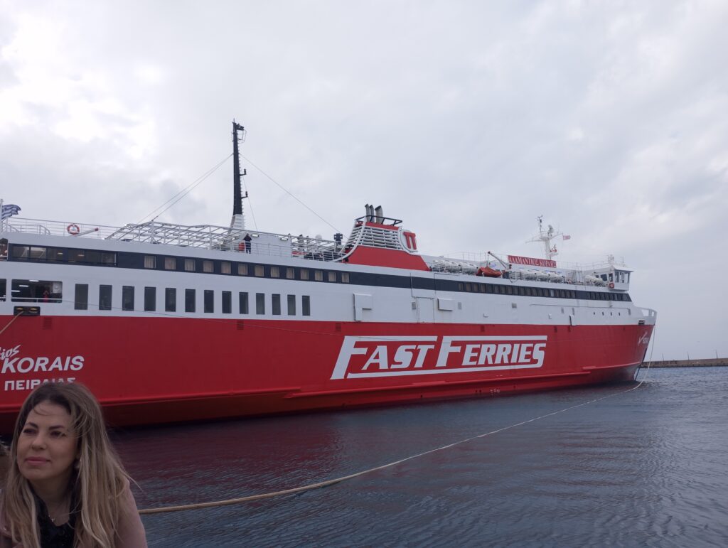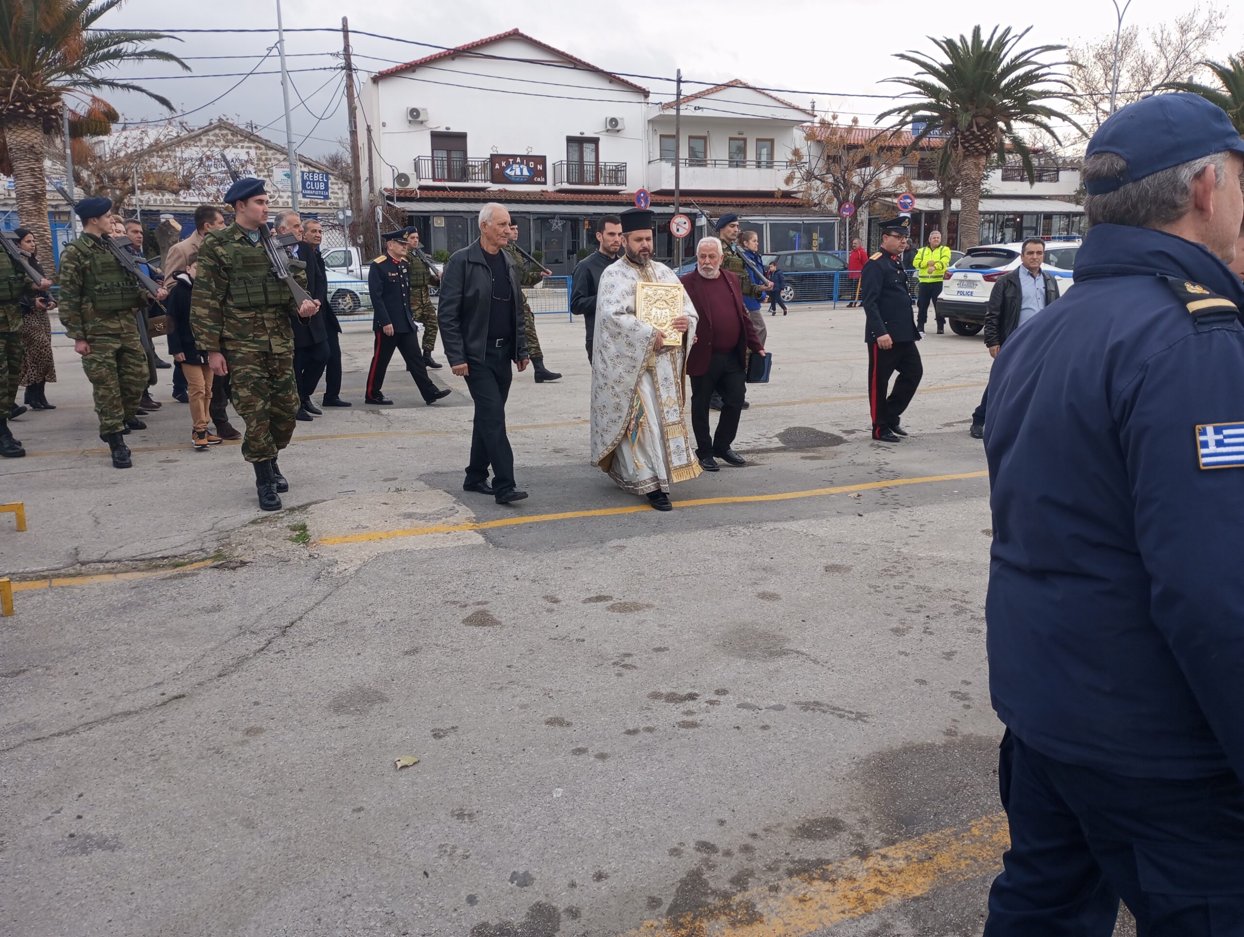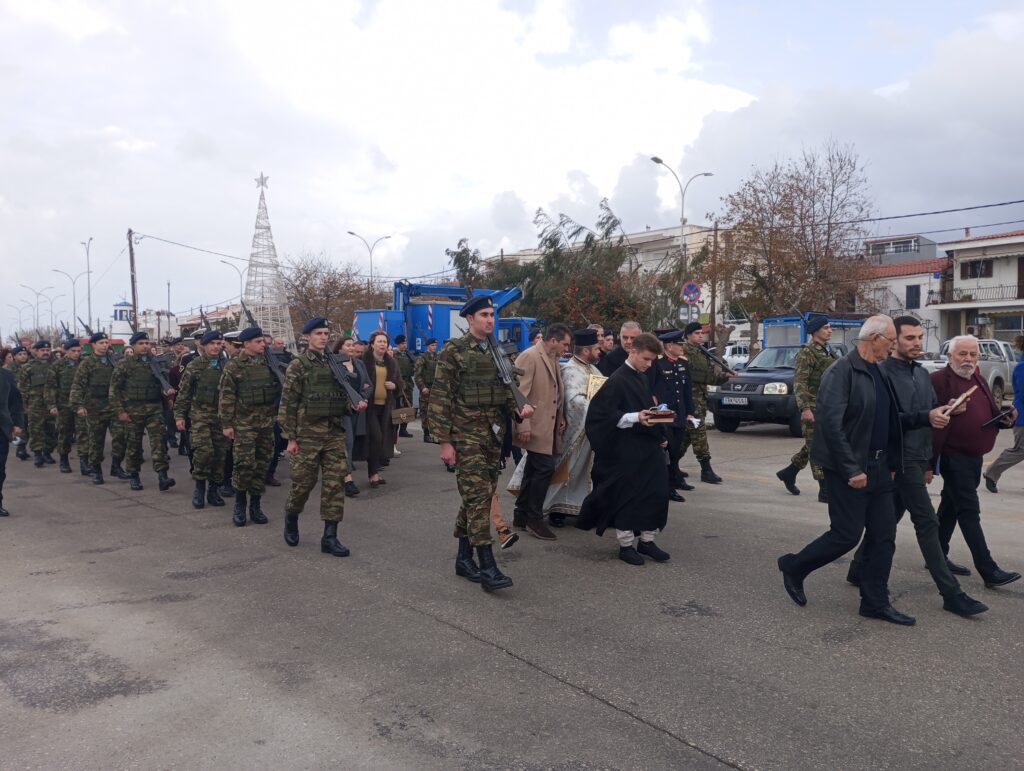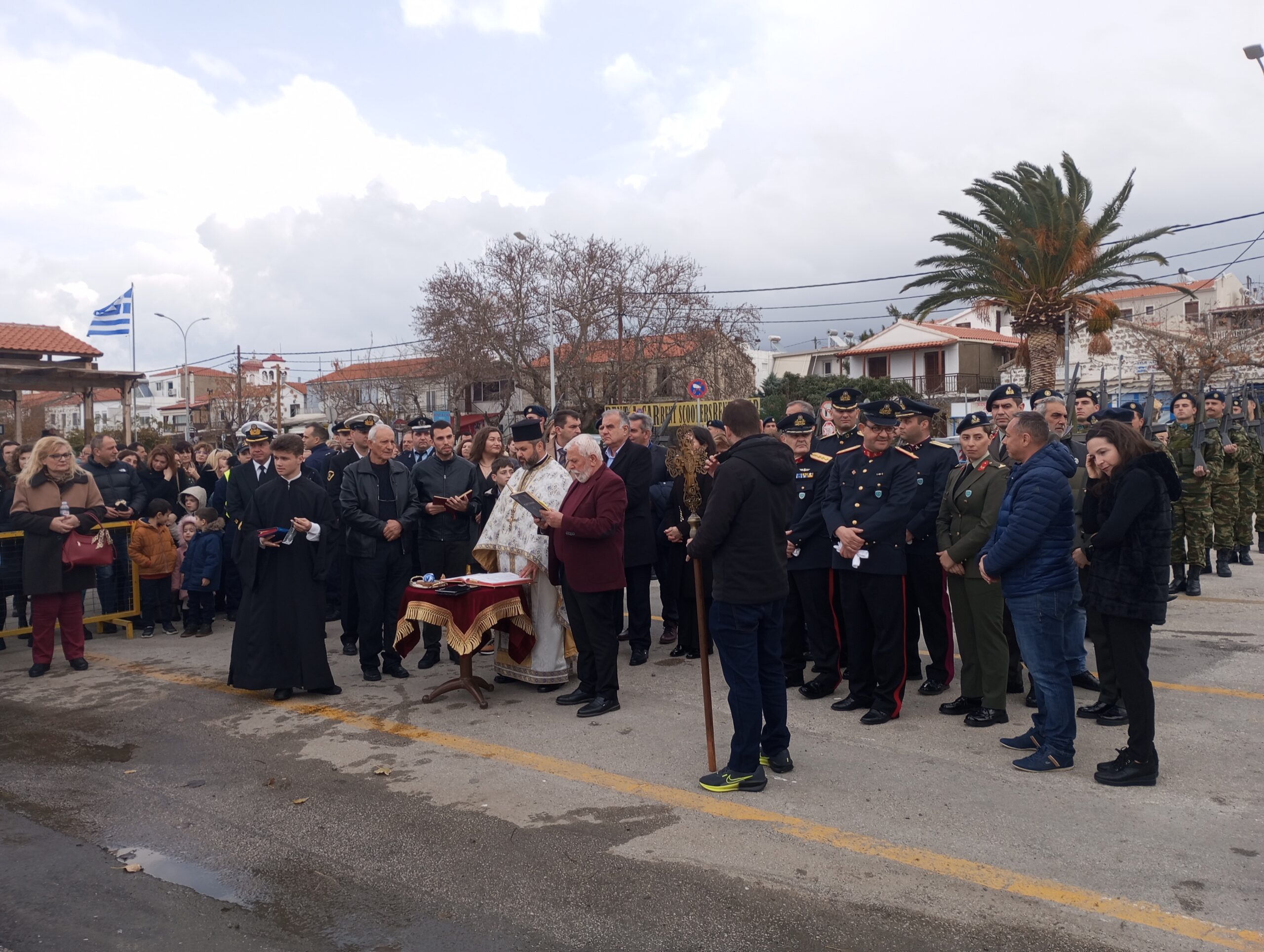 Στην συνέχεια το εκκλησίασμα ακολούθησε τον παπά Γιάννη και τις αρχές στο λιμάνι, αφού τελικά ο καιρός το επέτρεψε και δεν επιβεβαιώθηκαν οι προβλέψεις για βροχές και καταιγίδες για τον Αγιασμό των υδάτων και την ρίψη του Σταυρού στην θάλασσα. Μάλιστα φέτος αυτό έγινε με σημαντική καθυστέρηση μιας και στις 11:00 θα έφτανε στο λιμάνι το Ε/Γ-Ο/Γ ΑΔΑΜΑΝΤΙΟΣ ΚΟΡΑΗΣ από την Αλεξανδρούπολη.