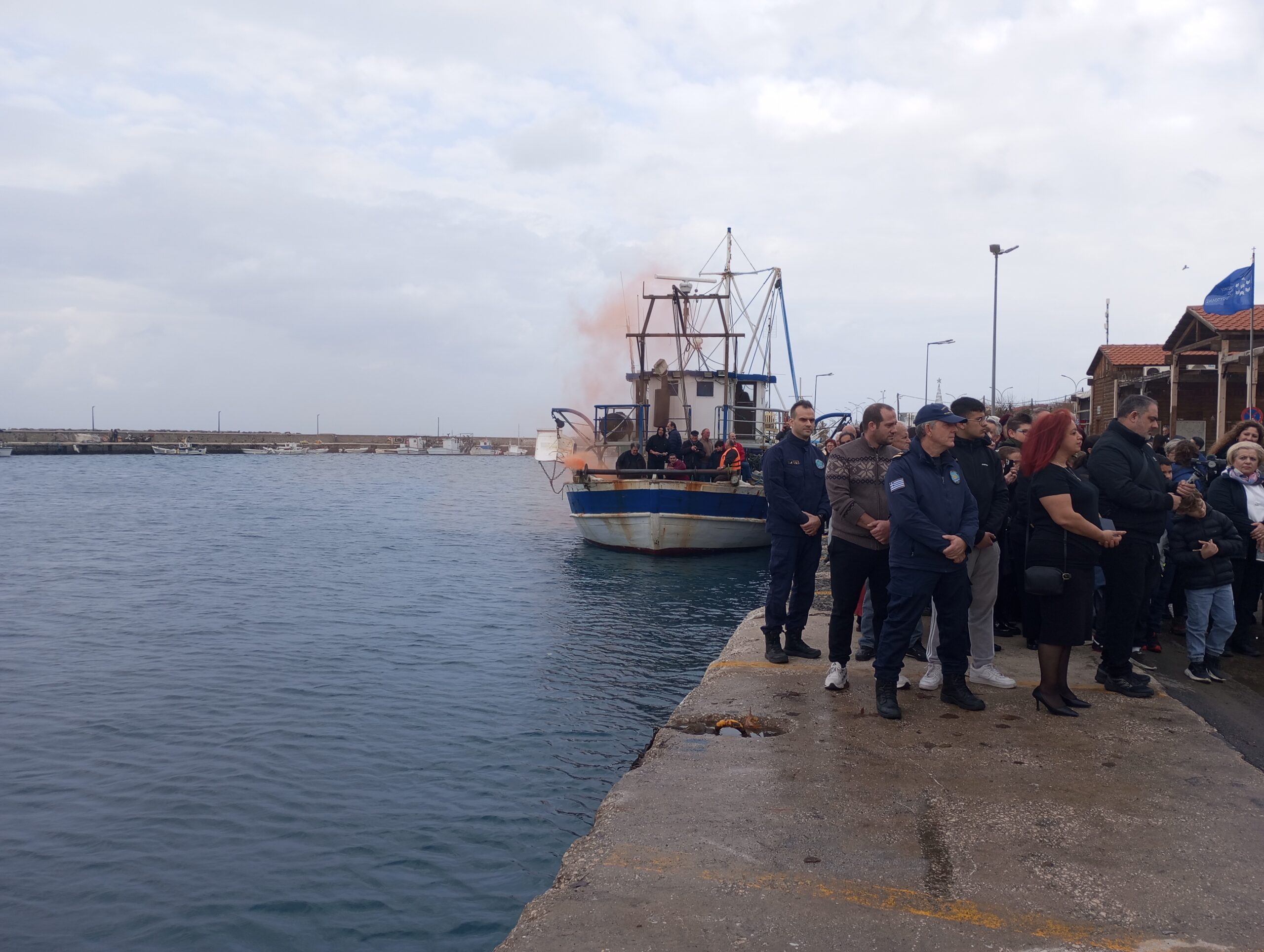 Αφού ο ιερέας μετά την μικρή λειτουργία στο λιμάνι έριξε τον Σταυρό στην θάλασσα και έπεσαν 2 παλικάρια για να τον πιάσουν, ο Στράτος Ν. Γερονικολάκης και ο Βασίλης Σέλος, υπό τα σφυρίγματα του Ε/Γ-Ο/Γ ΑΔΑΜΑΝΤΙΟΣ ΚΟΡΑΗΣ και ψαροκάικων τα οποία μάλιστα είχαν ανάψει και καπνογόνα. Τελικά τον Σταυρό κατάφερε να πιάσει ο πρώτος.