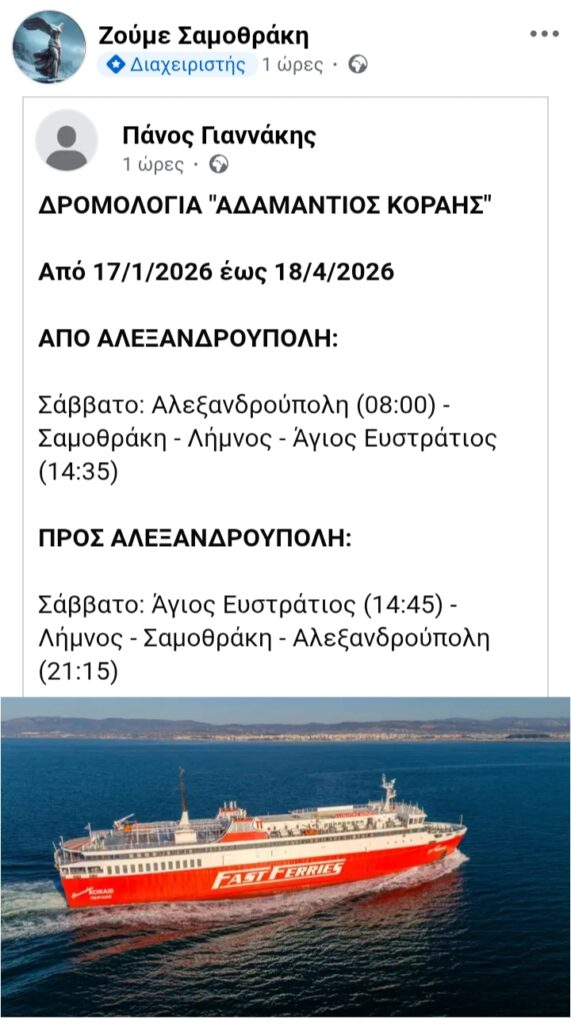 Χθες το βράδυ στην σελίδα “Ζούμε Σαμοθρακη” (facebook) είδα μία ανάρτηση που αναφέρονταν σε δρομολόγια του Ε/Γ-Ο/Γ ΑΔΑΜΑΝΤΙΟΣ ΚΟΡΑΗΣ από 17/1 έως 18/4 και περιλαμβάνουν την Λήμνο και τον Άγιο Ευστράτιο. Παραξενεύτηκα και προσέτρεξα στην σελίδα της FAST FERRIES. Όντως έχουν αναρτηθεί τα δρομολόγια μάλιστα από 12/1 έως 19/4 και όντως με την Λήμνο και τον Άγιο Ευστράτιο.