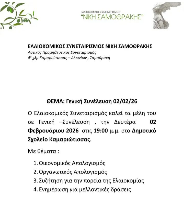 Ο Ελαιοκομικός Συνεταιρισμός “Νίκη Σαμοθρακης” προσκαλεί τα μέλη του σε δύο εκδηλώσεις.
