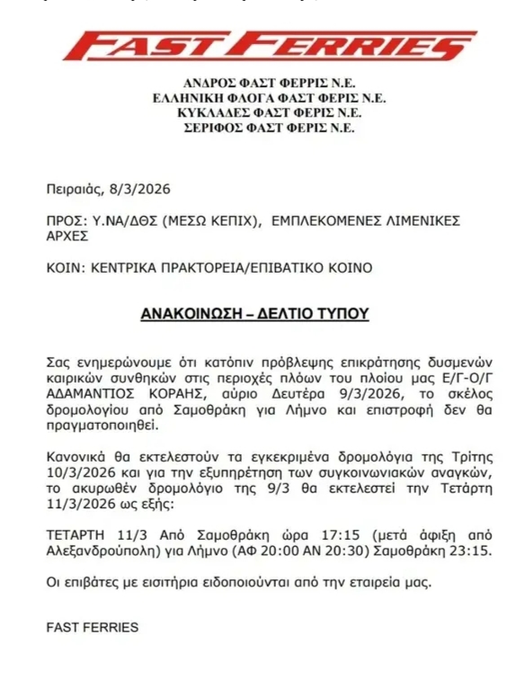 Το δρομολόγιο απο Σαμοθράκη για Λημνο και επιστροφή αυριο 9/3/2026 δεν θα πραγματοποιηθεί.