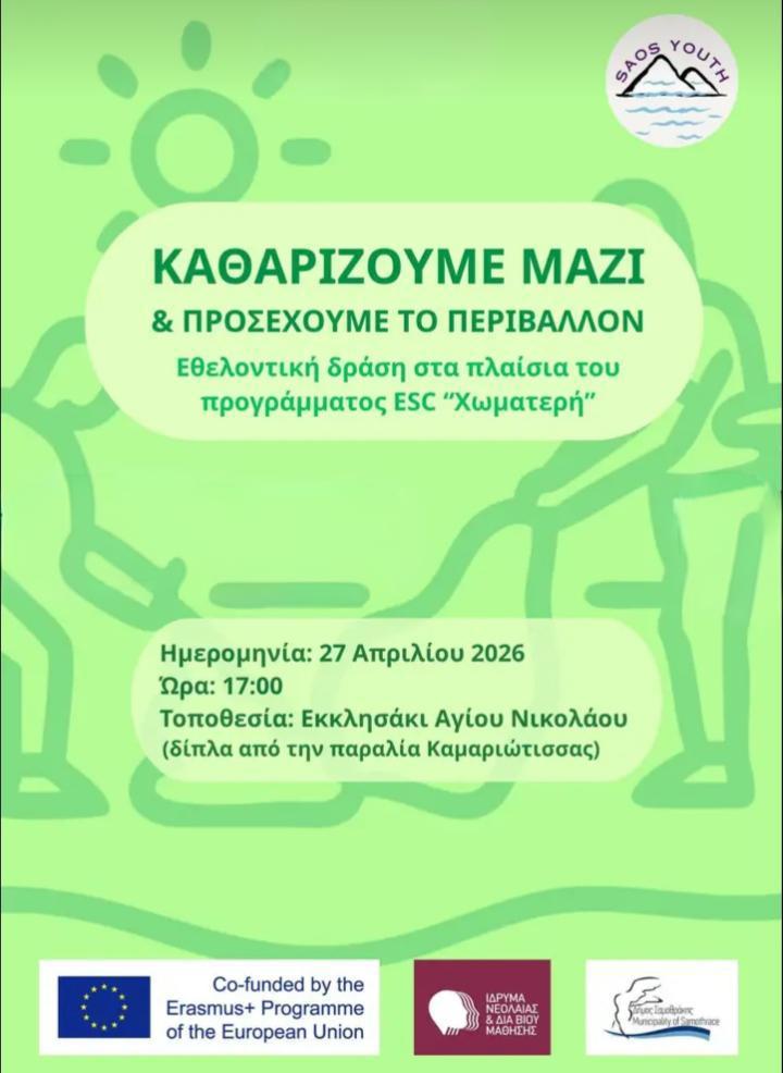 Η Ομάδα Εθελοντών του Δήμου Σαμοθράκης, σε συνεργασία με τη Saos Youth στο πλαίσιο του προγράμματος “European Solidarity Corps «Χωματερή»”, διοργανώνει εθελοντική δράση καθαρισμού και καλεί όλους τους κατοίκους του νησιού να συμμετάσχουν ενεργά.