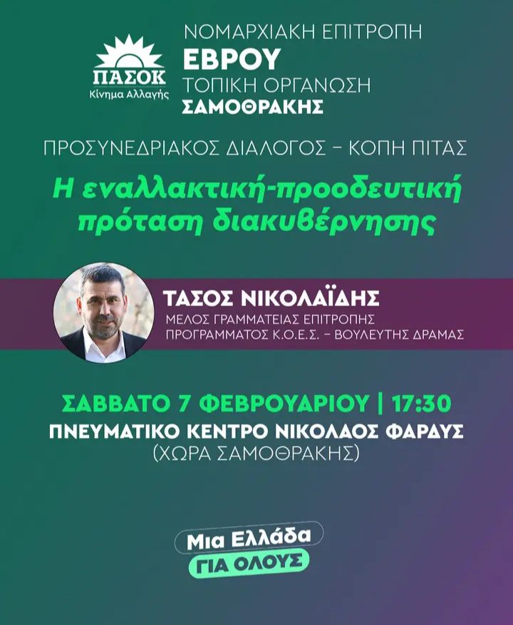 Το μέλος της Γραμματείας Επιτροπής Προγράμματος Κ.Ο.Ε.Σ. και Βουλευτής Δράμας, Τάσος Νικολαΐδης, θα παραβρεθεί στην Ολομέλεια του ΠΑΣΟΚ- Κινήματος Αλλαγής Ν. Έβρου (Τ.Ο. Σαμοθράκης) που θα πραγματοποιηθεί στο Πνευματικό Κέντρο Νικόλαος Φαρδύς στη Χώρα Σαμοθράκης.