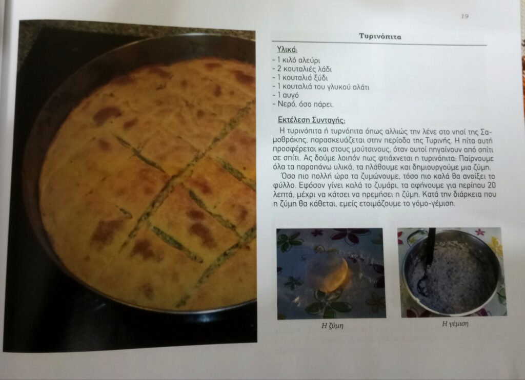 Ακολουθεί συνταγή Τυρί(ι)νόπιτας από το βιβλίο “Εδεσματολόγιο & Διατροφικές Συνήθειες της Σαμοθράκης” του Αναστάσιου Κυριακίδη, ενός φίλου της Σαμοθράκης.