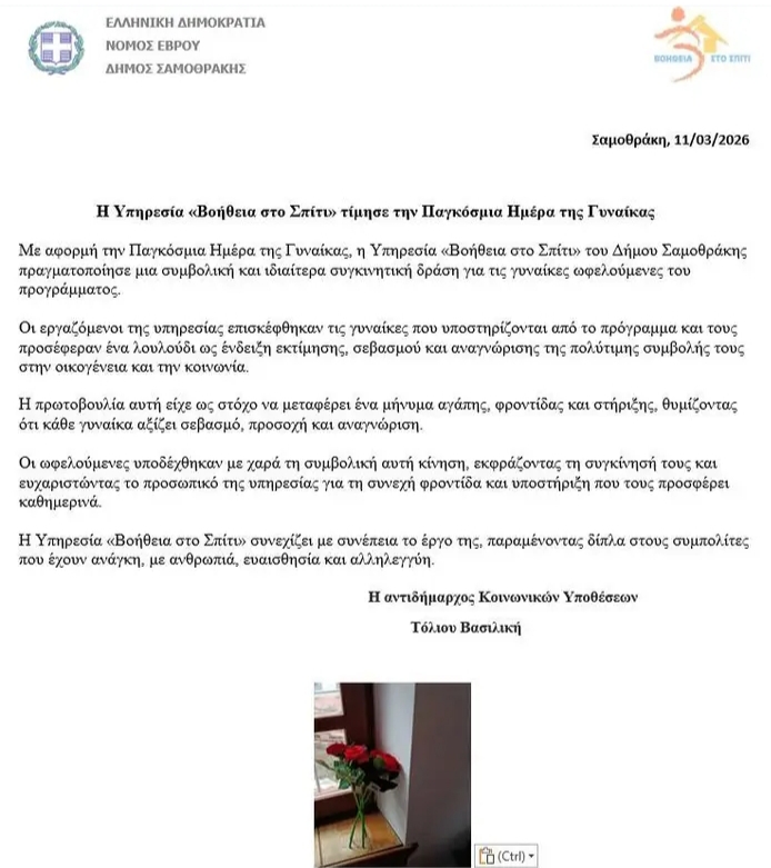 Η Αντιδήμαρχος Κοινωνικών Υποθέσεων του Δήμου Σαμοθράκης κυρία Βασιλική Τόλιου εξέδωσε ανακοίνωση με την οποία ενημερώνει την τοπική κοινωνία για την συμβολική δράση που πραγματοποίησε η Υπηρεσία Βοήθεια στο Σπίτι στα πλαίσια του εορτασμού της Παγκόσμιας Ημέρας της Γυναίκας για τις ωφελούμενες του προγράμματος.