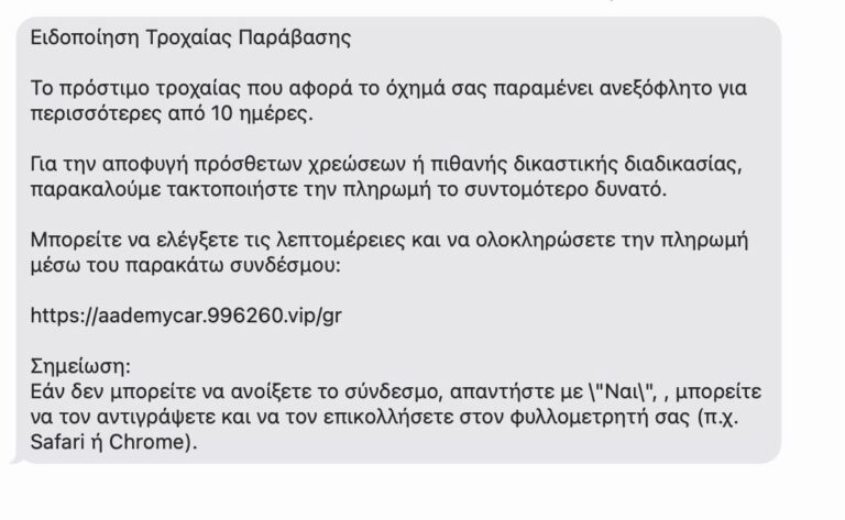 Το τελευταίο διάστημα παρατηρούνται αναφορές για αποστολή παραπλανητικών μηνυμάτων τύπου phishing σε πολίτες. Ειδικότερα, αποστέλλονται ψευδή μηνύματα SMS τα οποία ενημερώνουν δήθεν για ανεξόφλητο πρόστιμο τροχαίας παράβασης και καλούν τους πολίτες να επισκεφθούν συγκεκριμένο σύνδεσμο (link) για να ελέγξουν λεπτομέρειες ή να προχωρήσουν σε πληρωμή.